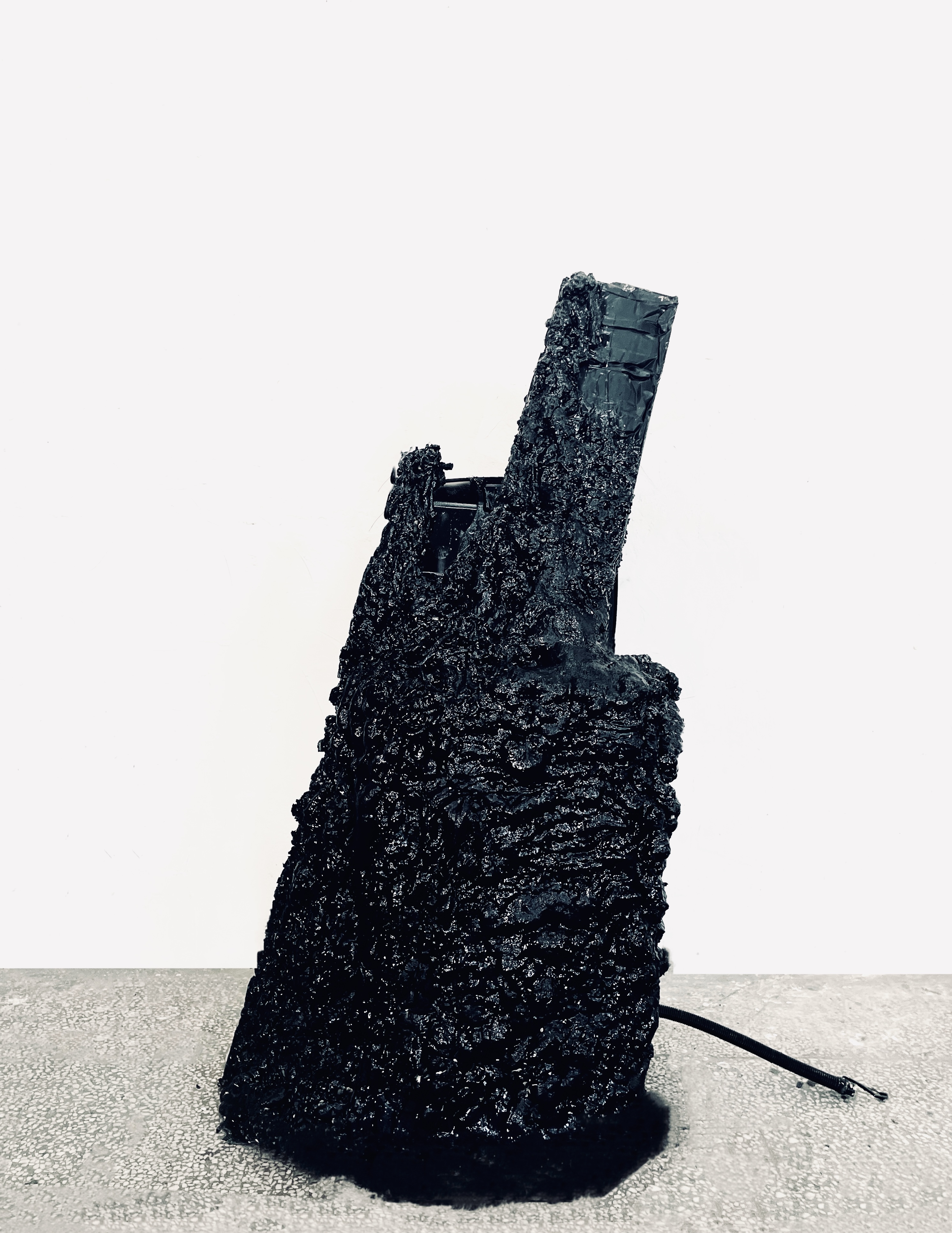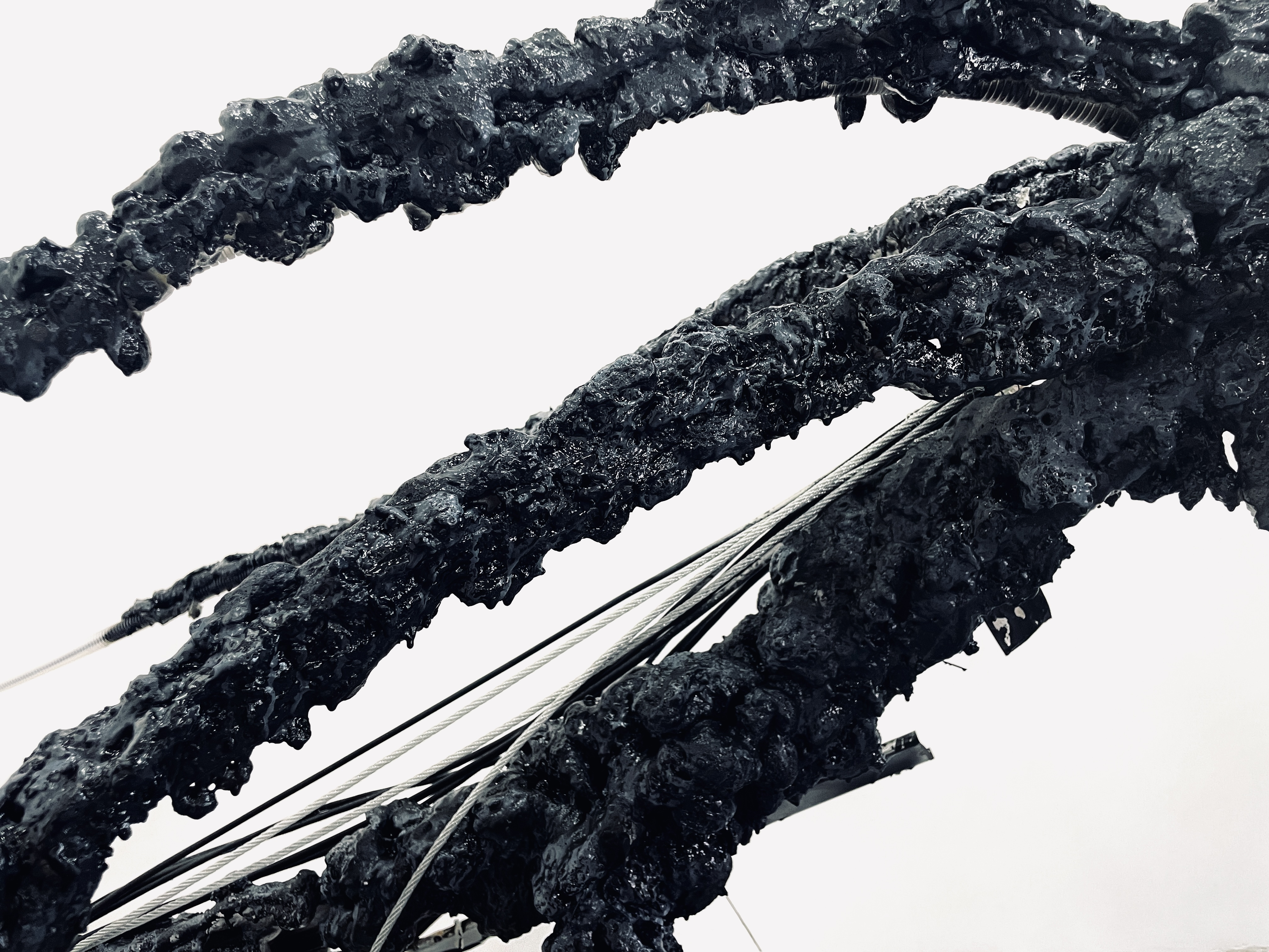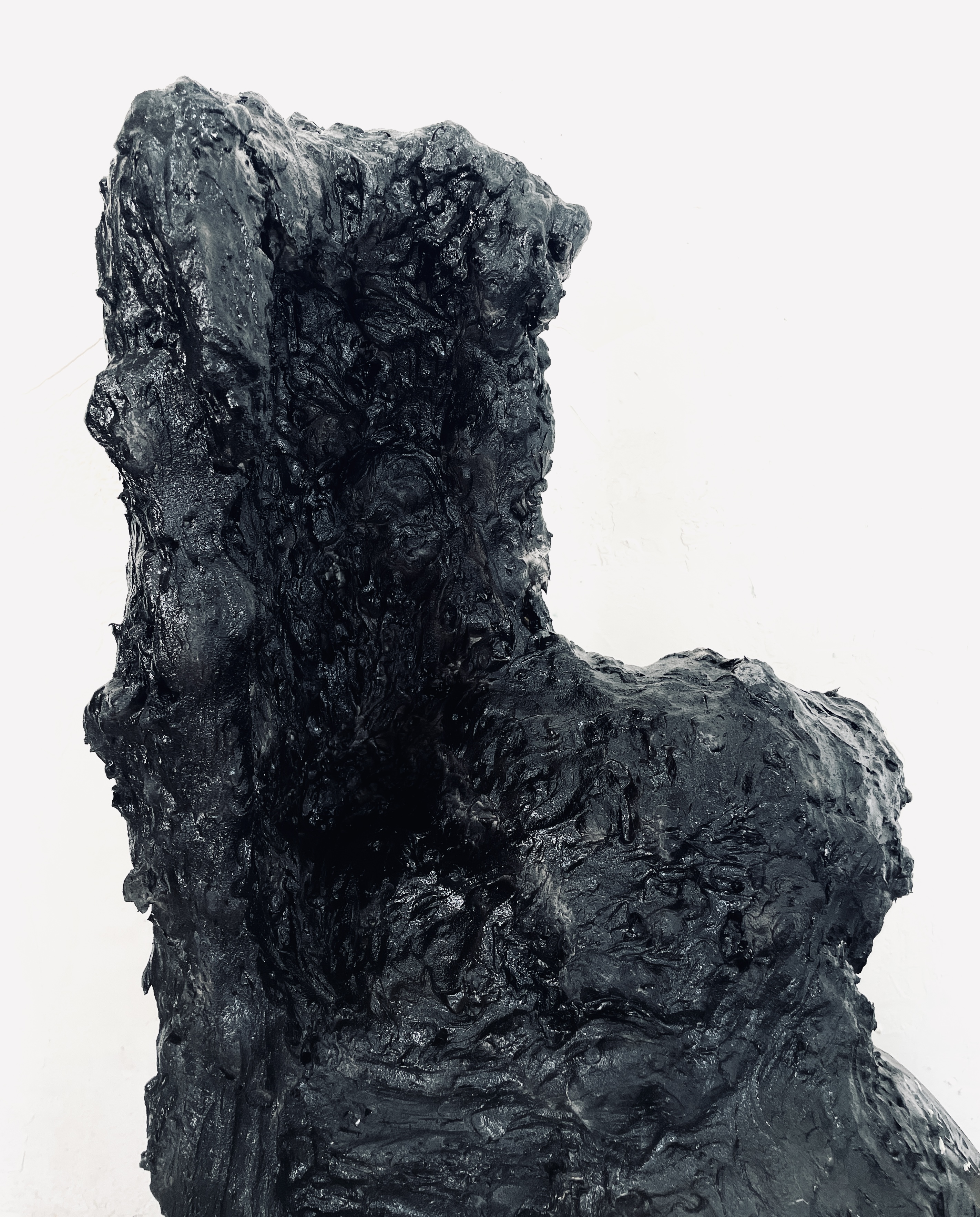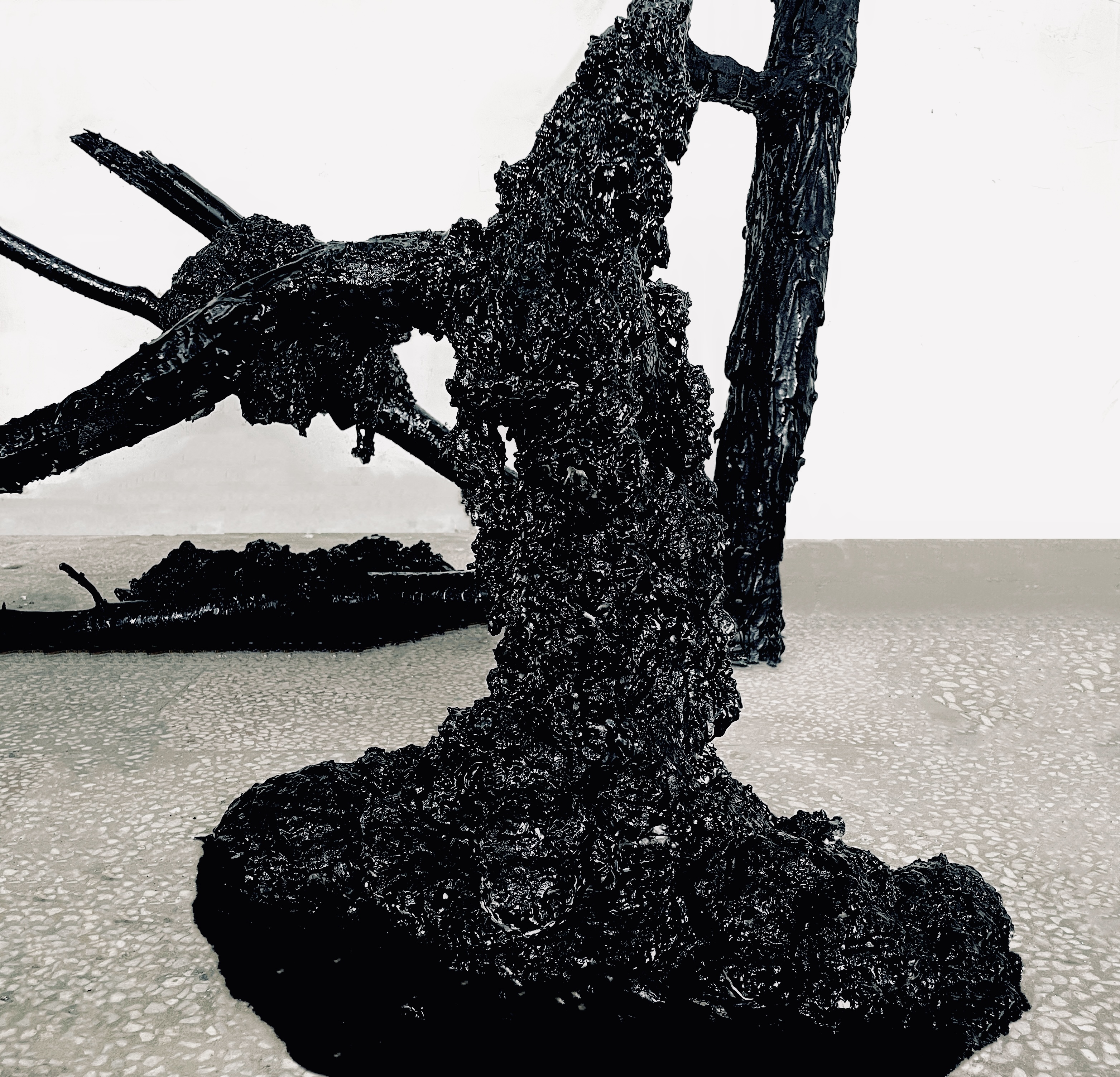Influenced by Linda Benglis' early works with polyurethane paints, I began experimenting with asphalt, opening up an exploration of this material. In the A Black River Disappears Me series, I experimented with a wide range of materials, including asphalt, polyurethane foam, iron, wood, and ready-made objects. These materials, combined with my exploration of their properties and interactions, reflect the destructive yet transformative power of the black river, symbolizing an ongoing process of decay and reconstruction.