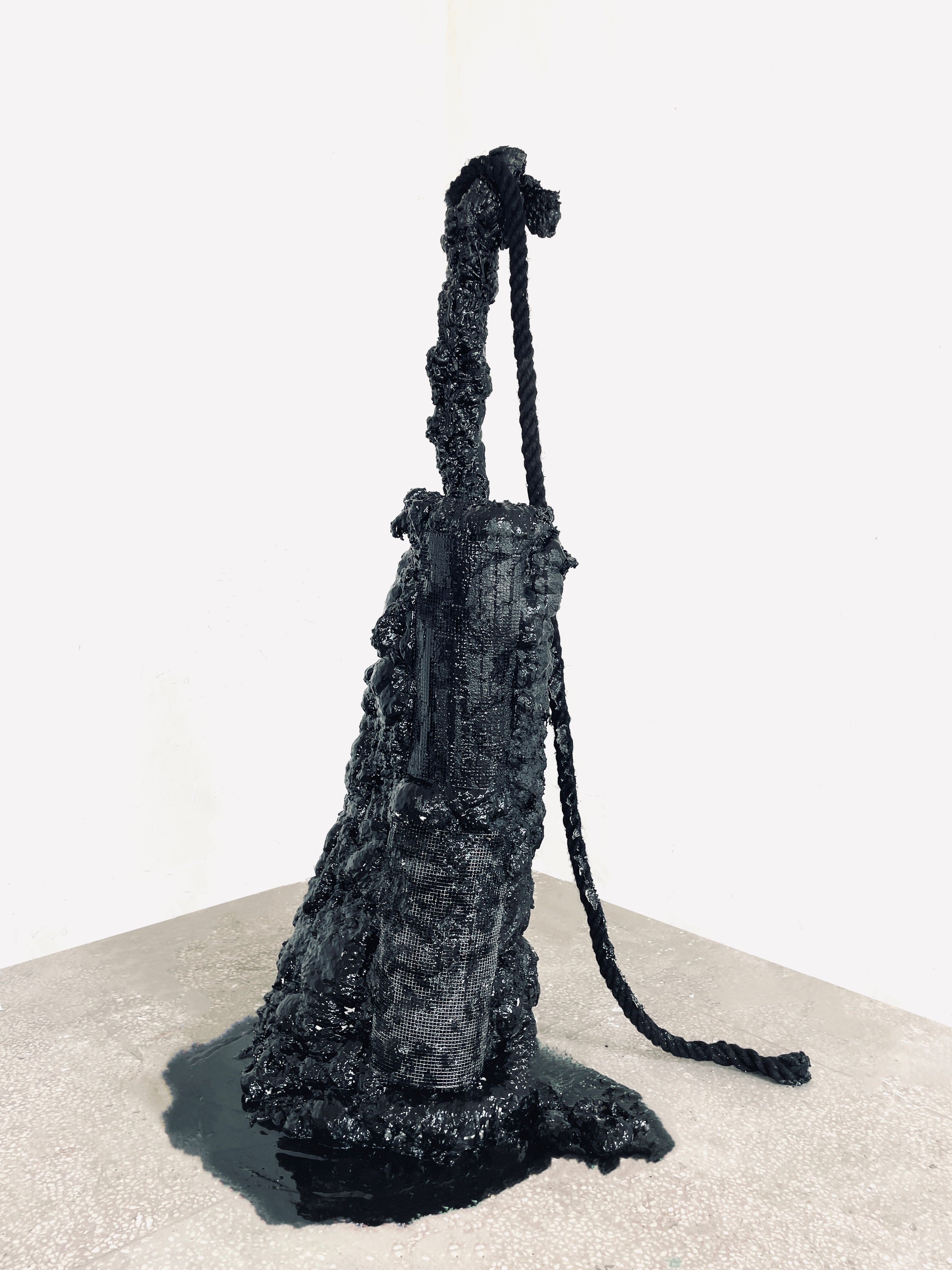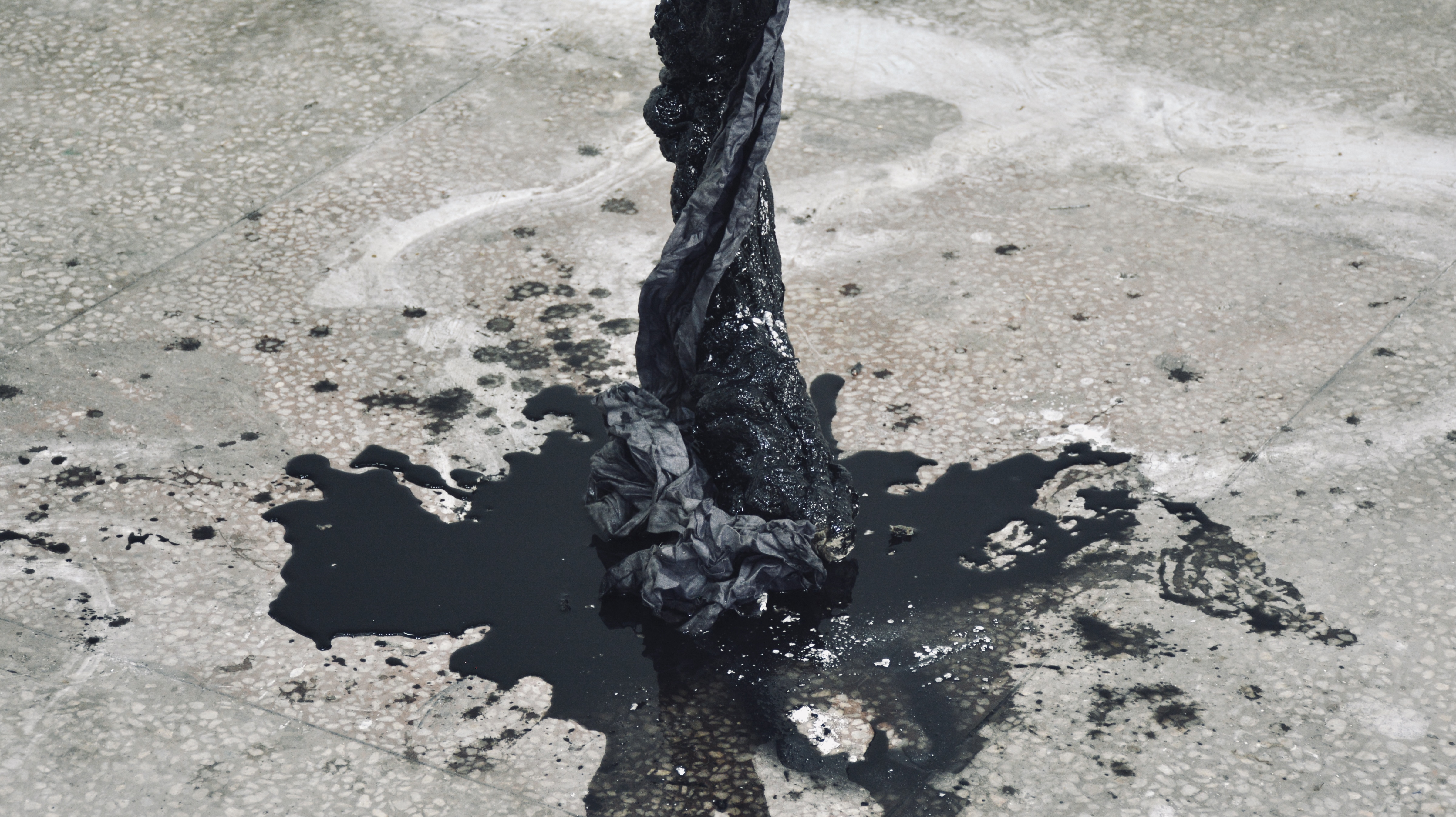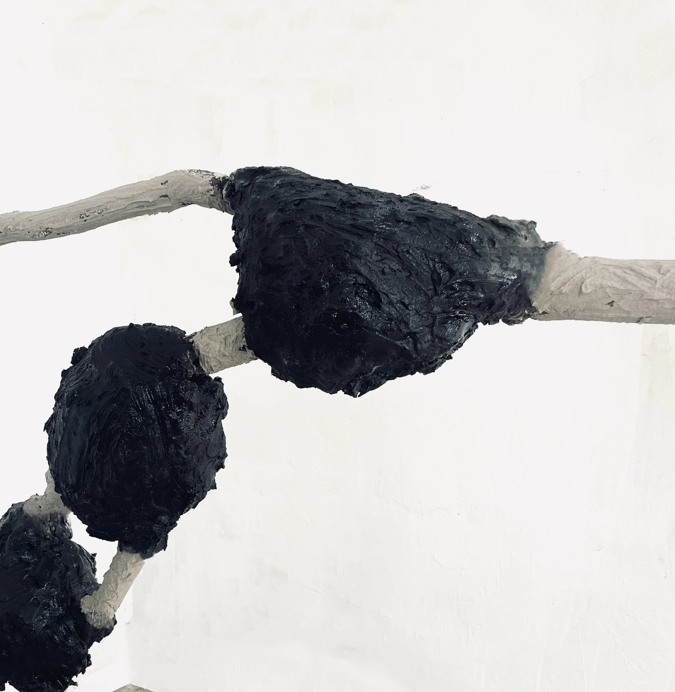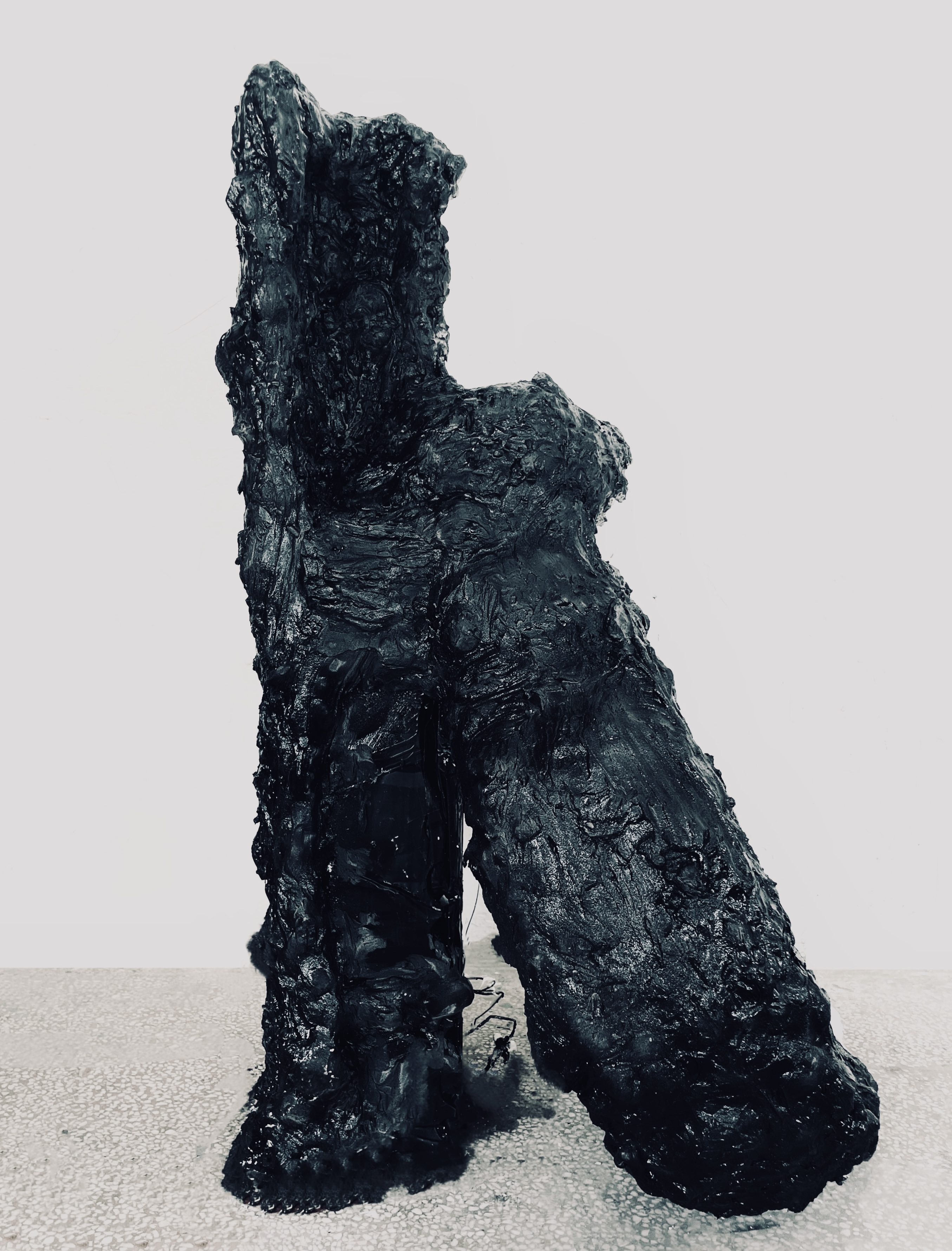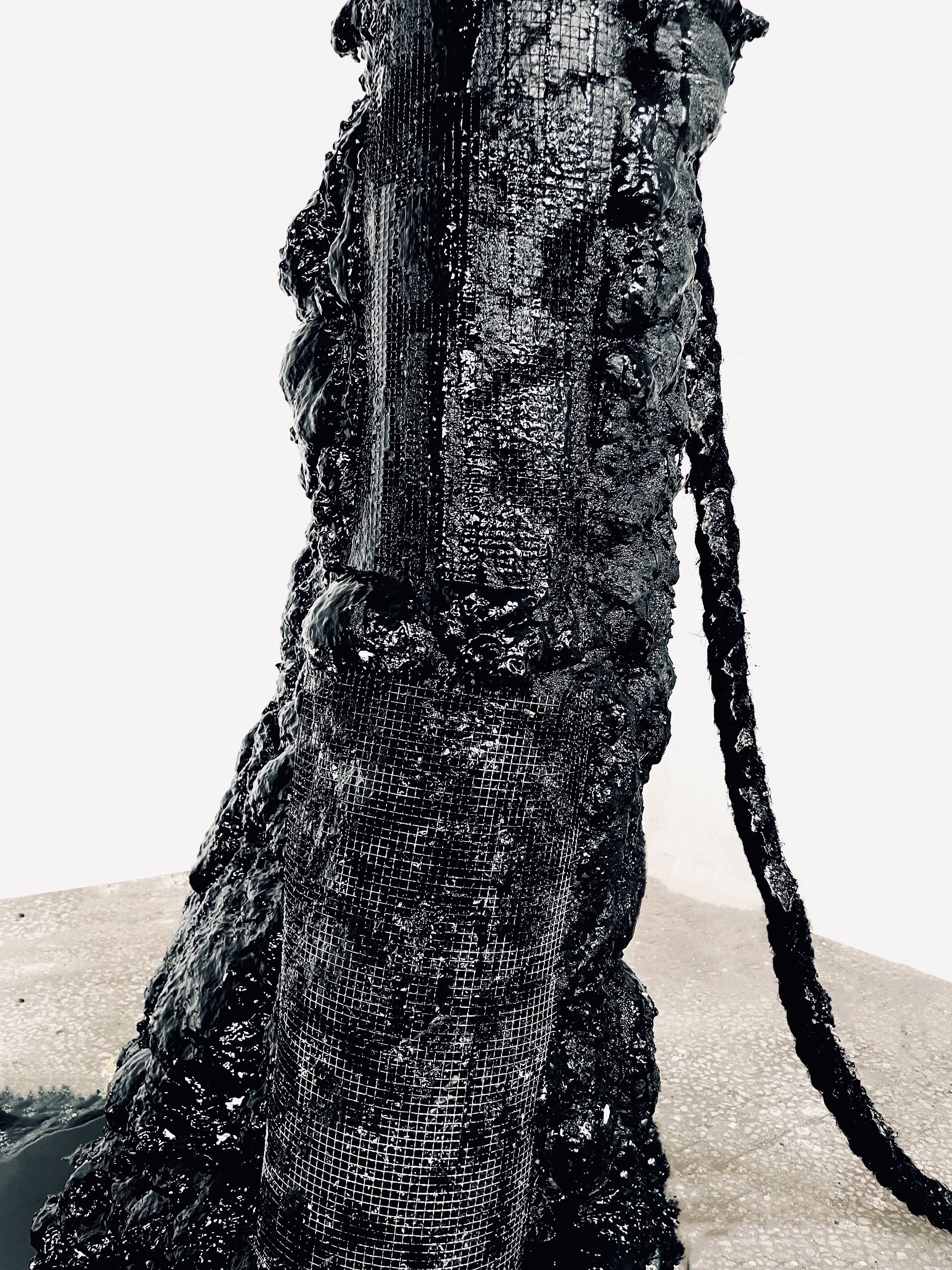 Influenced by Linda Benglis' early works with polyurethane paints, I began experimenting with asphalt, opening up an exploration of this material. In the A Black River Disappears Me series, I experimented with a wide range of materials, including asphalt, polyurethane foam, iron, wood, and ready-made objects. These materials, combined with my exploration of their properties and interactions, reflect the destructive yet transformative power of the black river, symbolizing an ongoing process of decay and reconstruction.