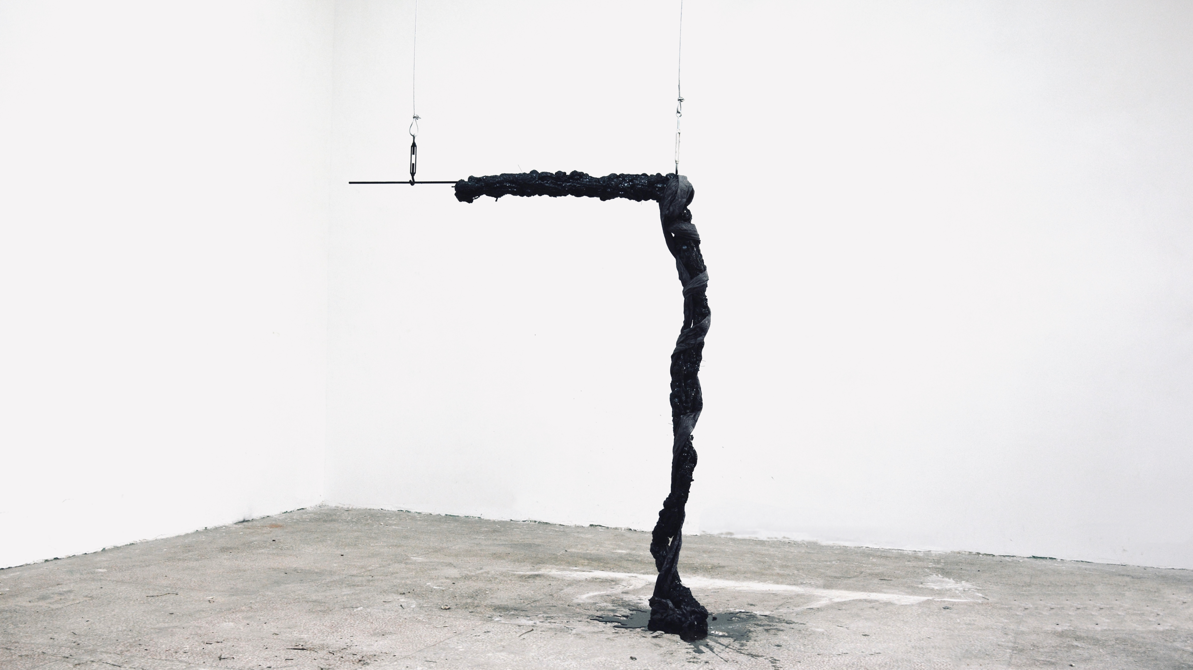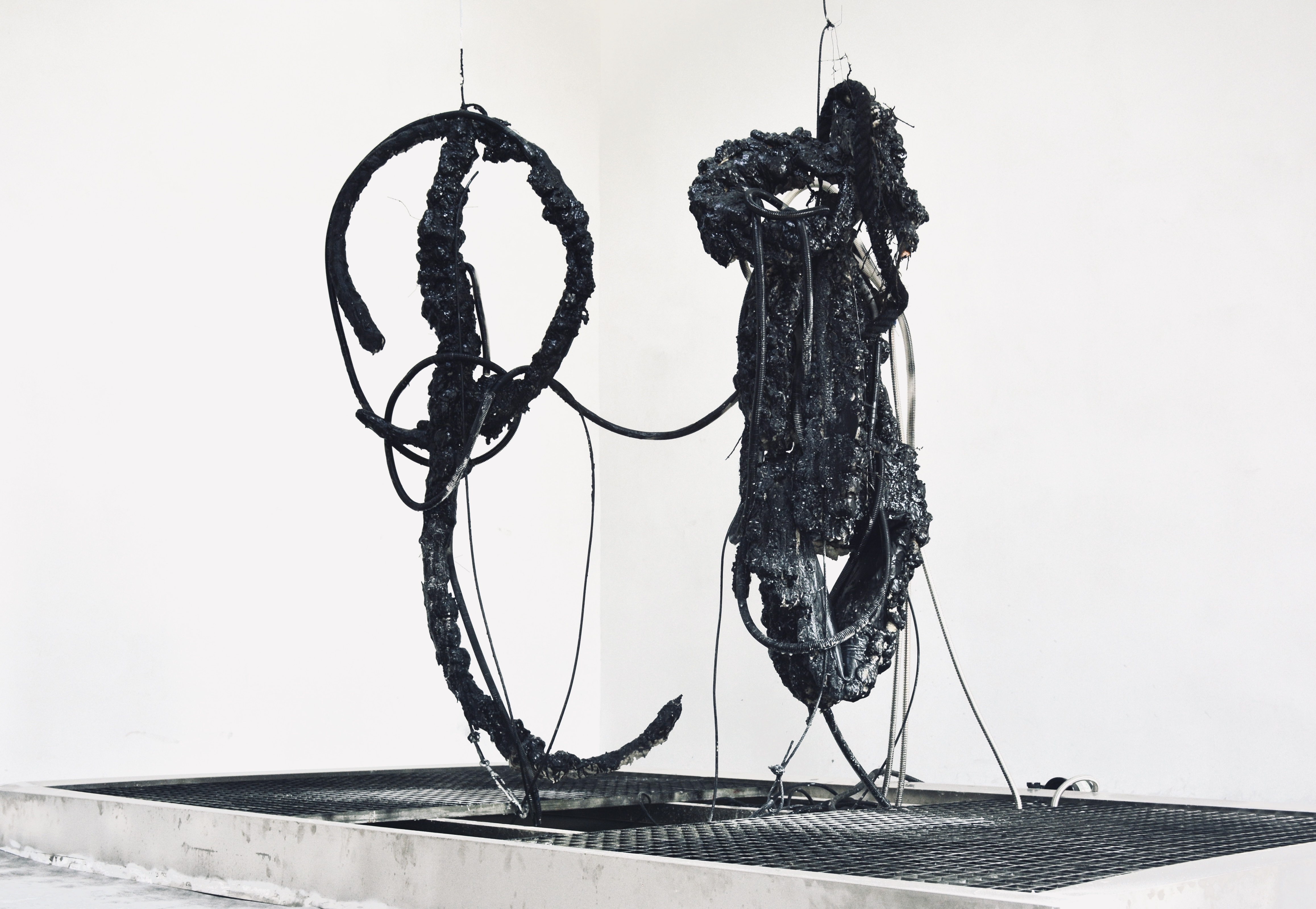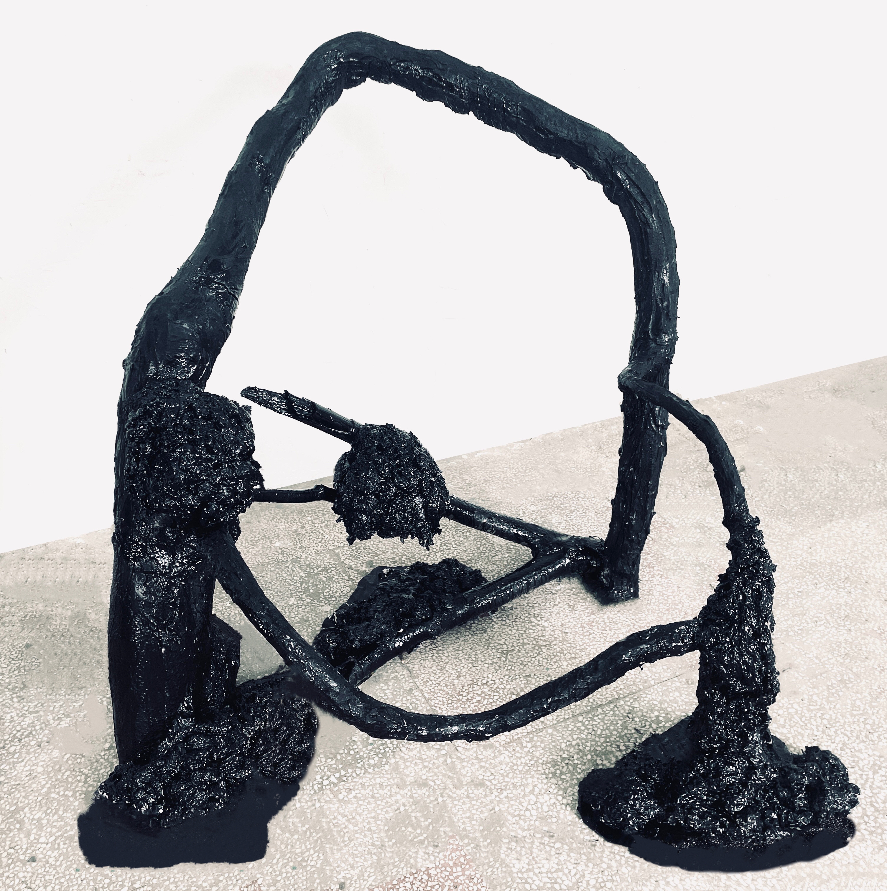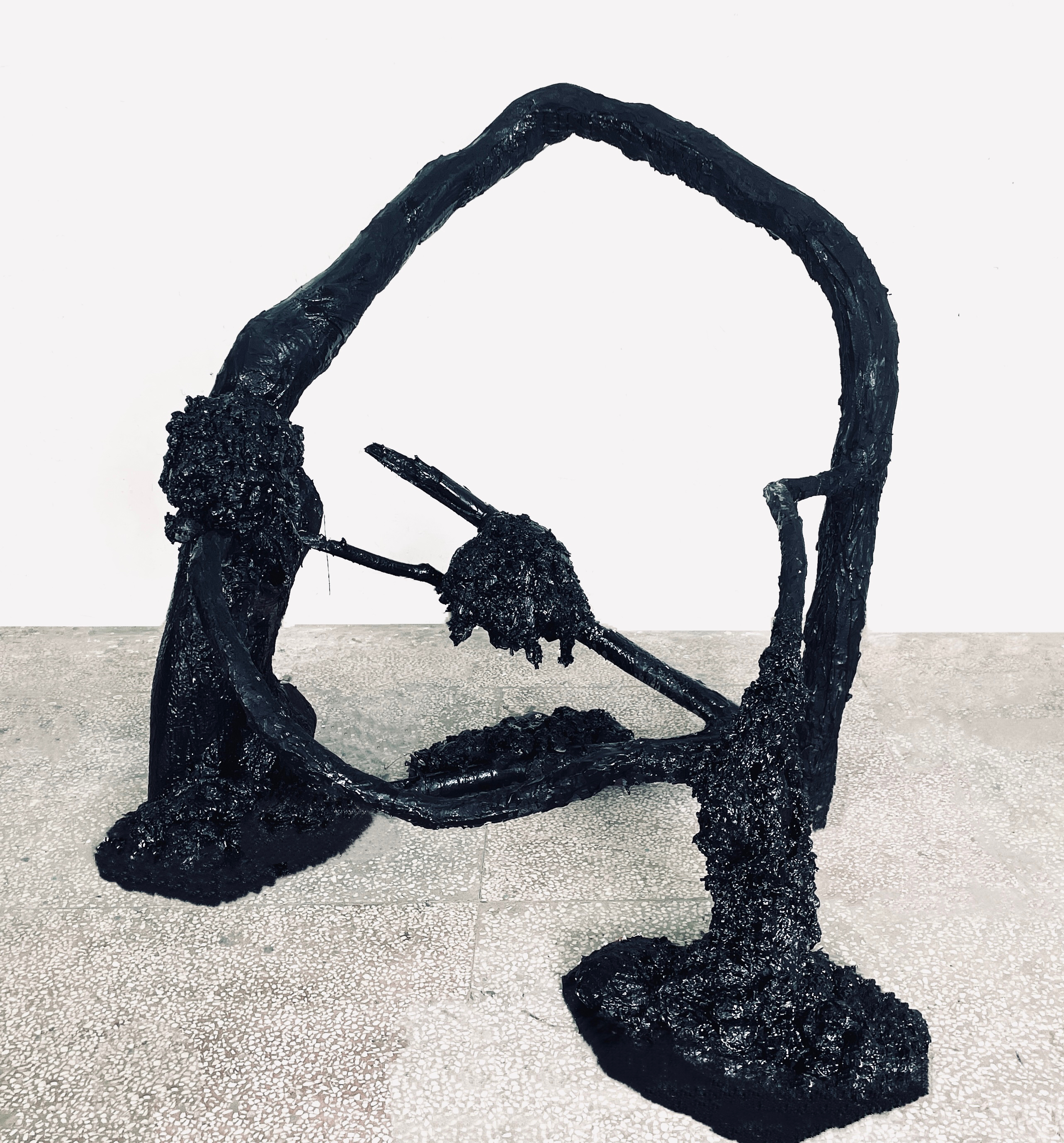 Influenced by Linda Benglis' early works with polyurethane paints, I began experimenting with asphalt, opening up an exploration of this material. In the A Black River Disappears Me series, I experimented with a wide range of materials, including asphalt, polyurethane foam, iron, wood, and ready-made objects. These materials, combined with my exploration of their properties and interactions, reflect the destructive yet transformative power of the black river, symbolizing an ongoing process of decay and reconstruction.