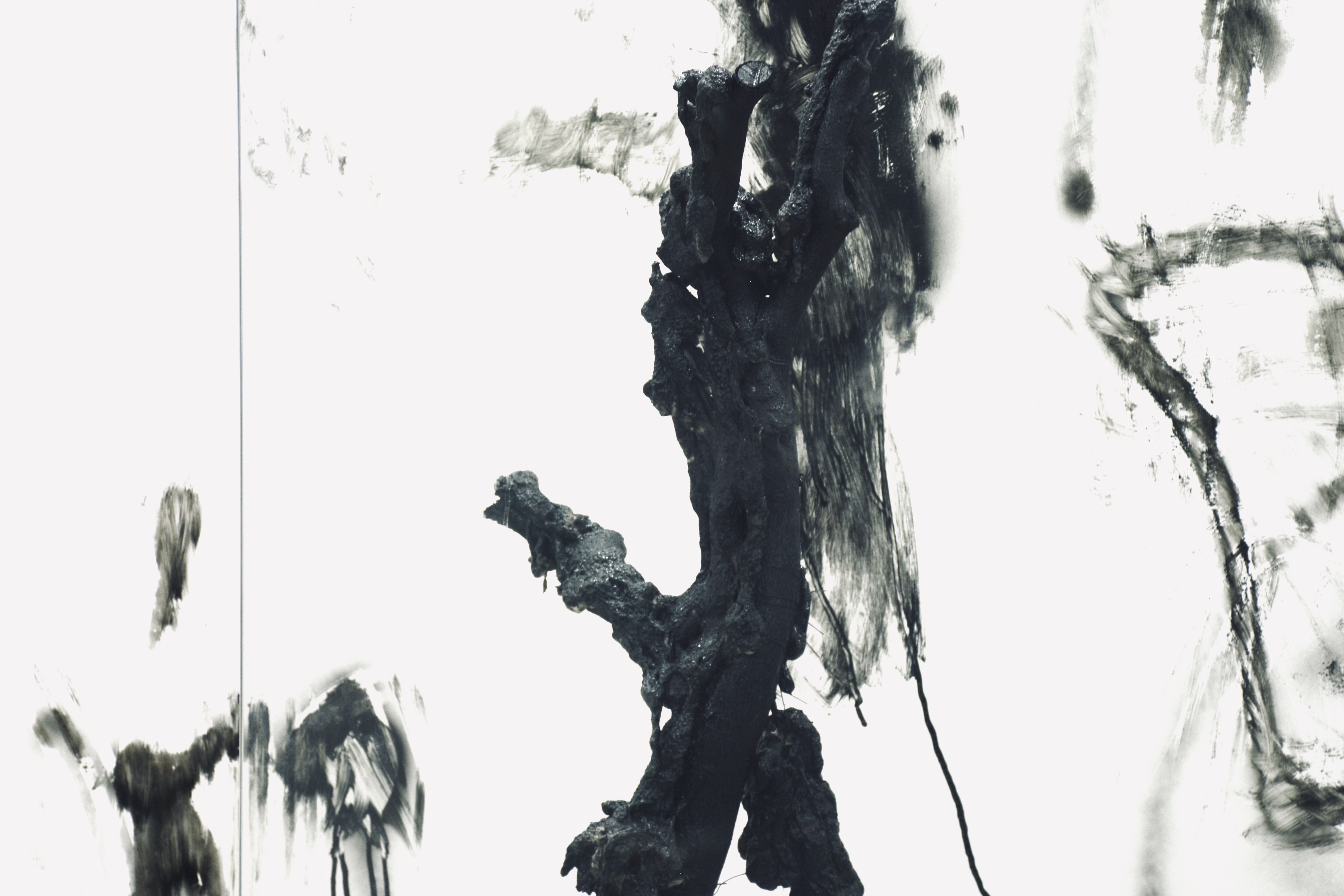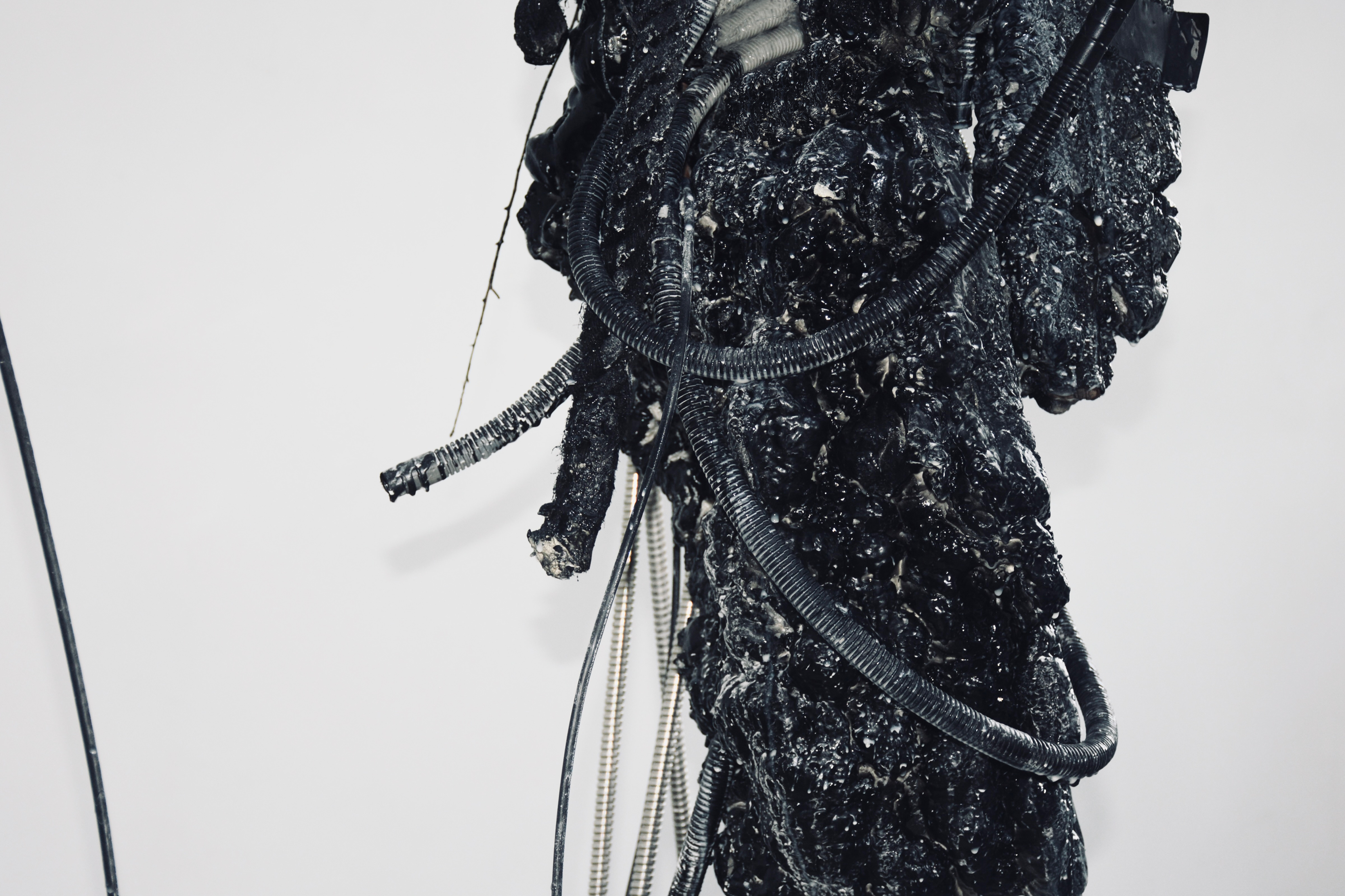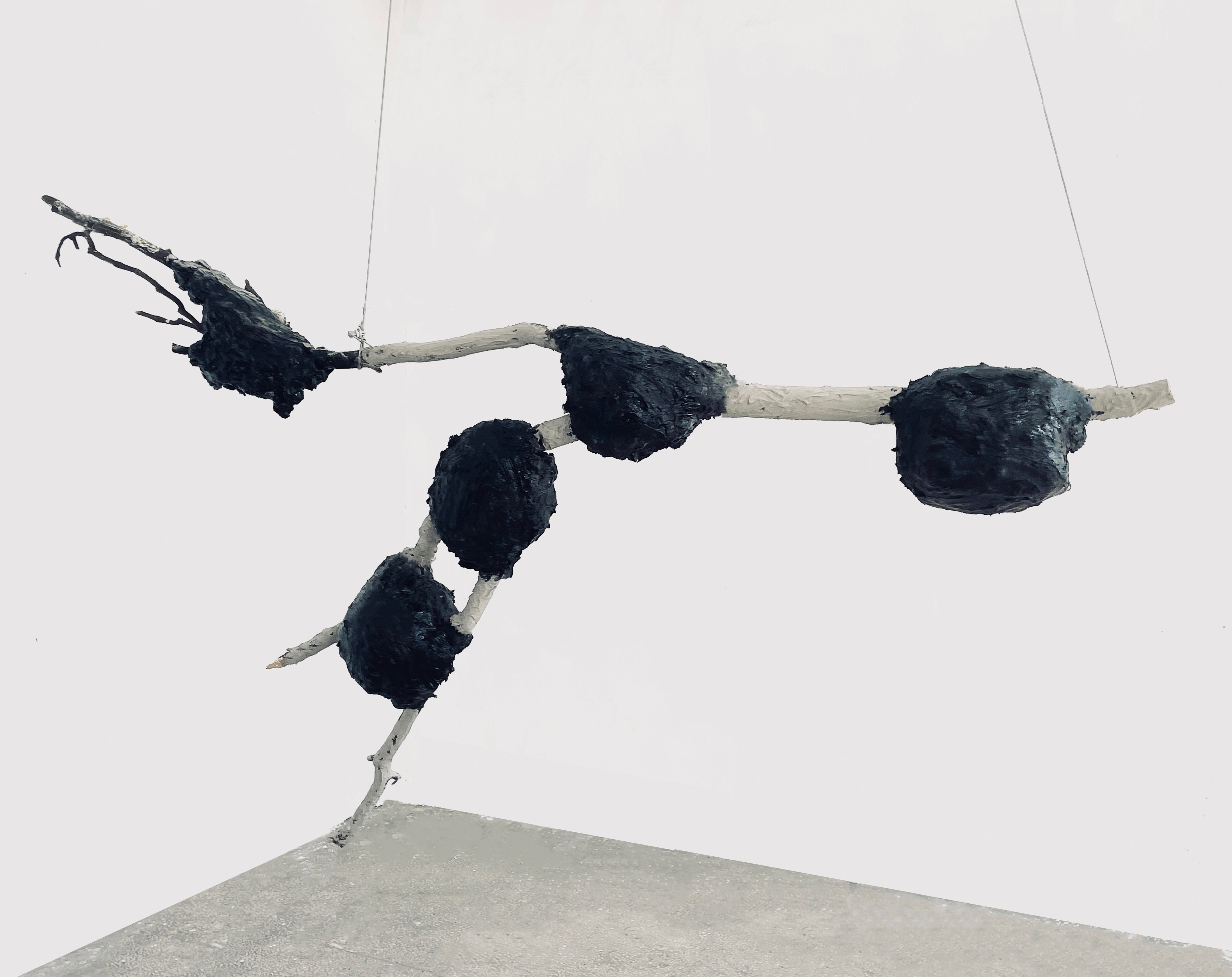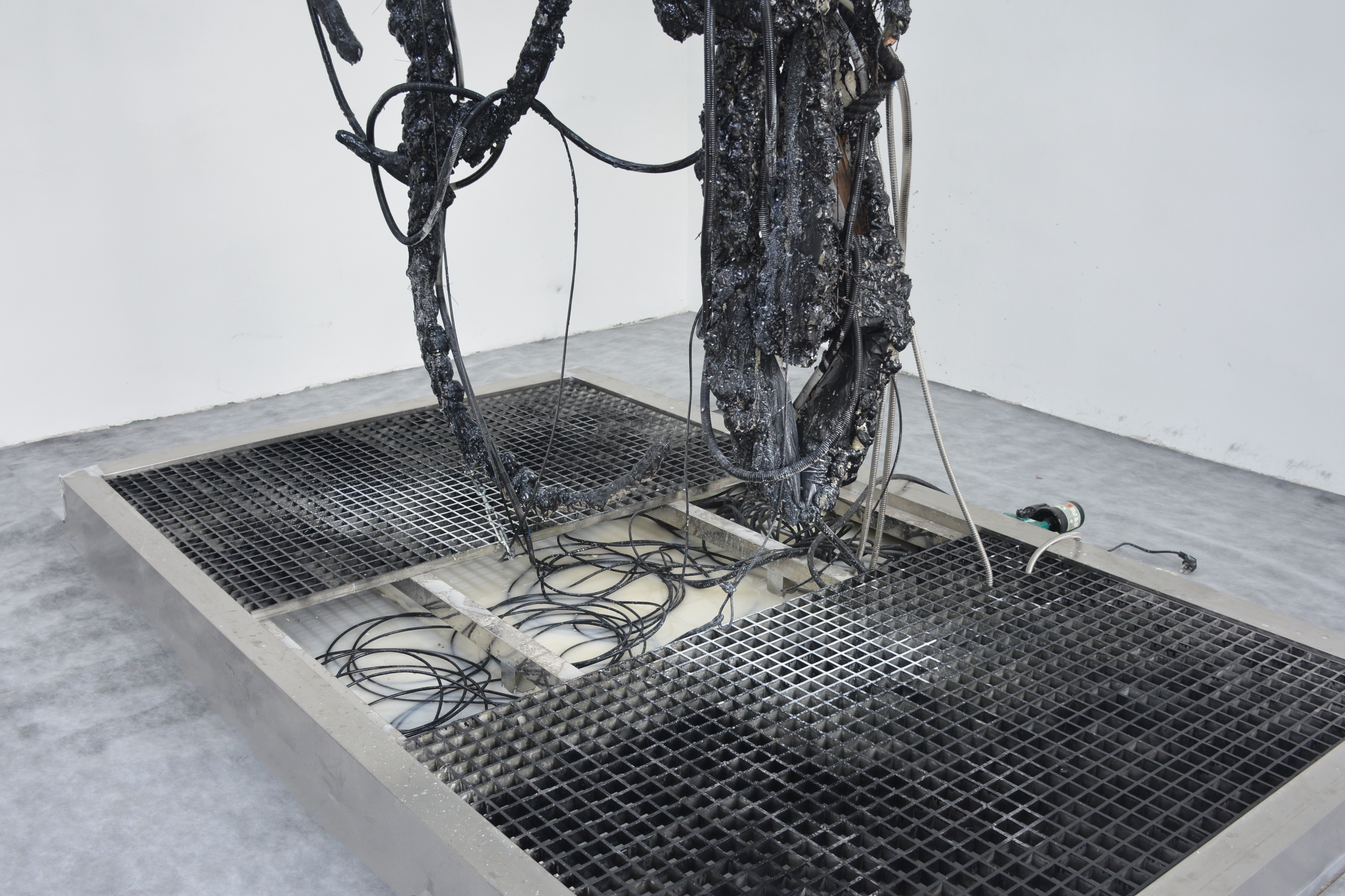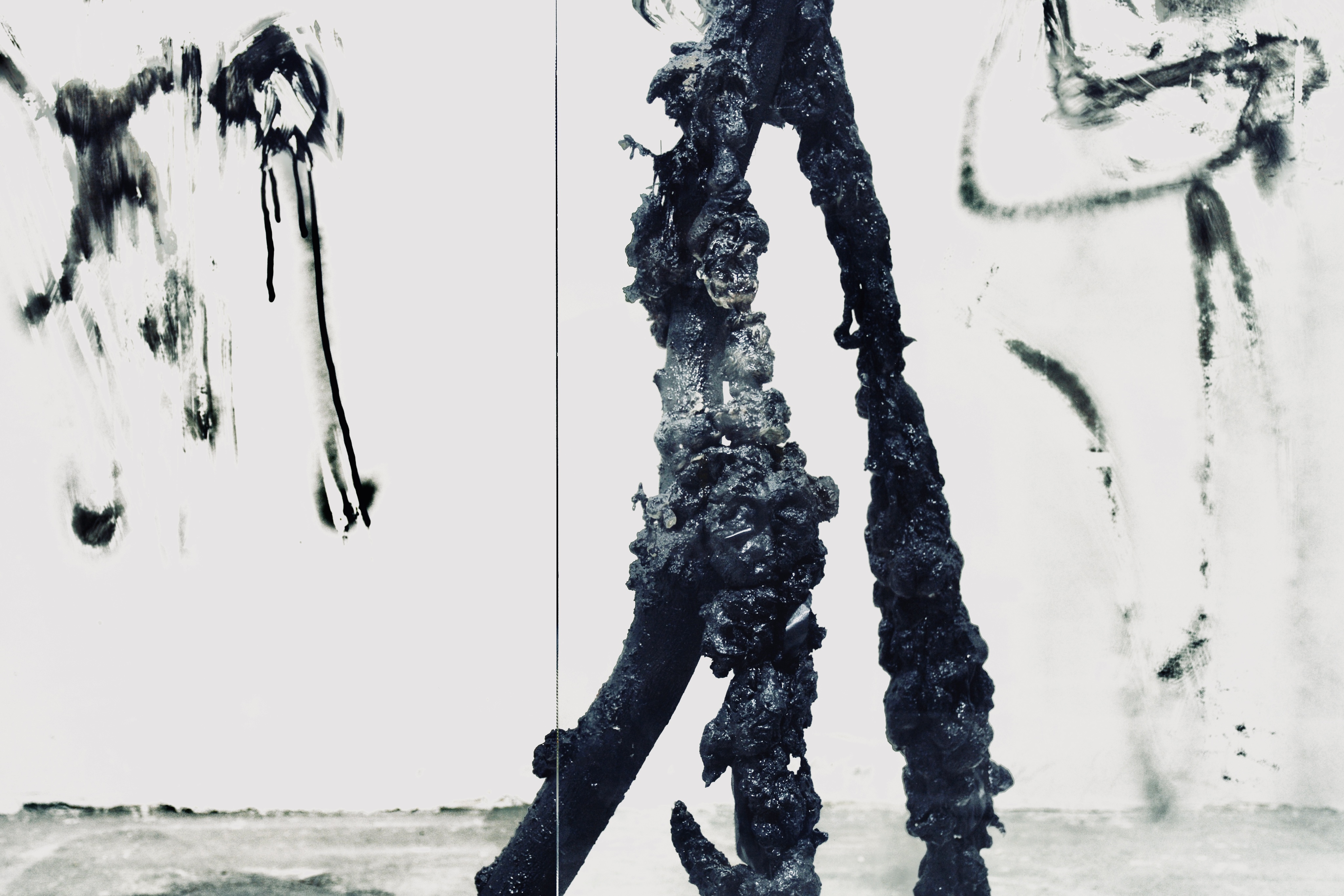 Influenced by Linda Benglis' early works with polyurethane paints, I began experimenting with asphalt, opening up an exploration of this material. In the A Black River Disappears Me series, I experimented with a wide range of materials, including asphalt, polyurethane foam, iron, wood, and ready-made objects. These materials, combined with my exploration of their properties and interactions, reflect the destructive yet transformative power of the black river, symbolizing an ongoing process of decay and reconstruction.