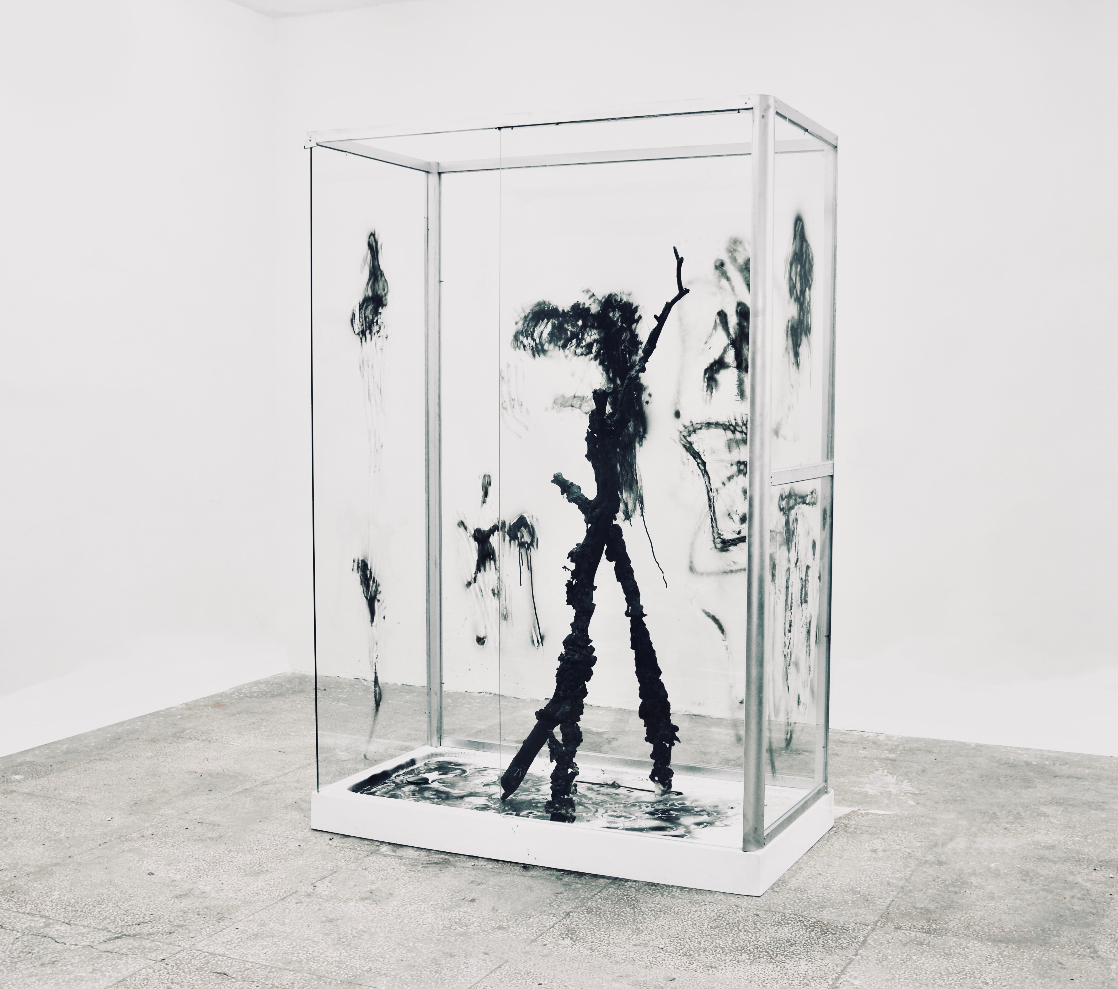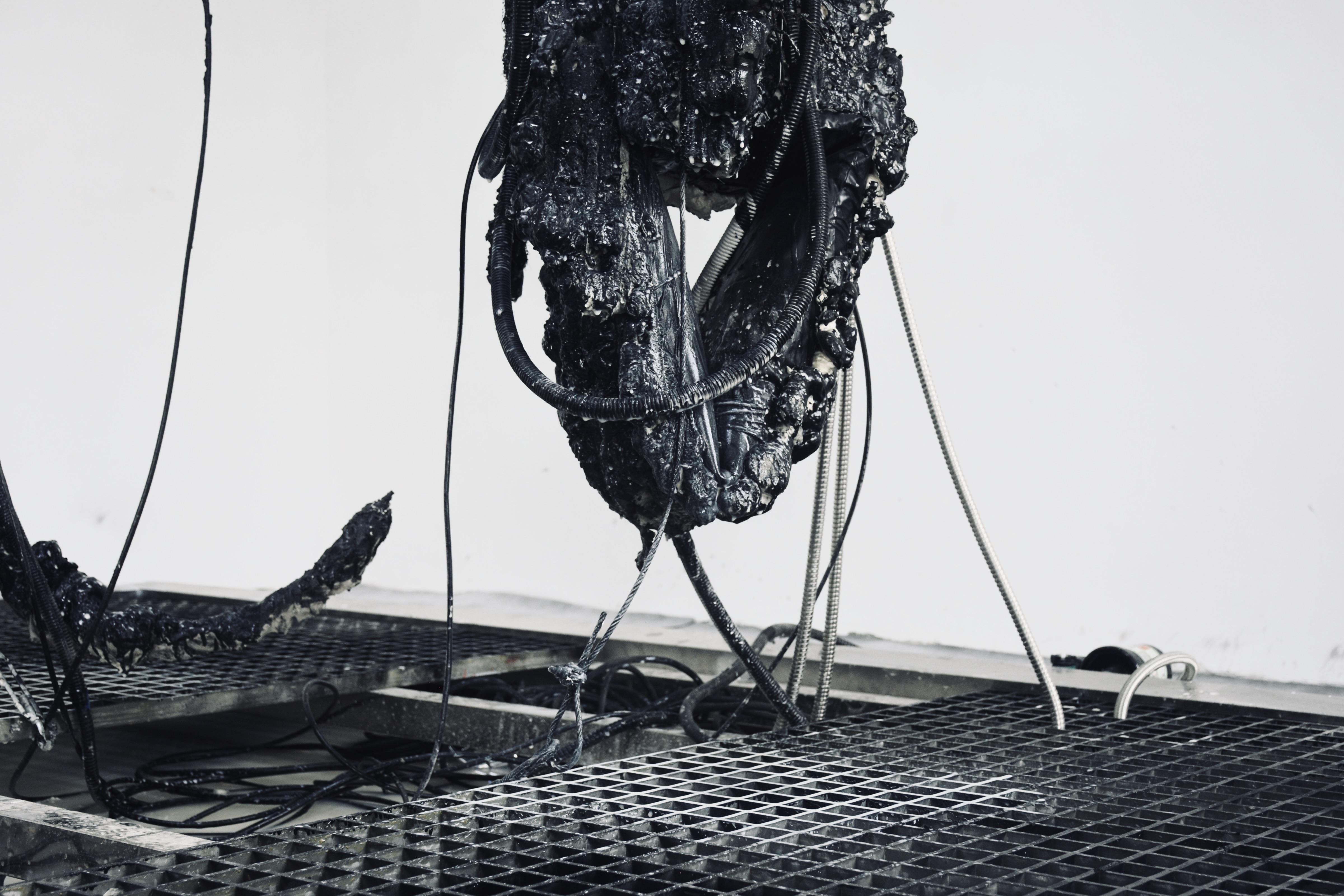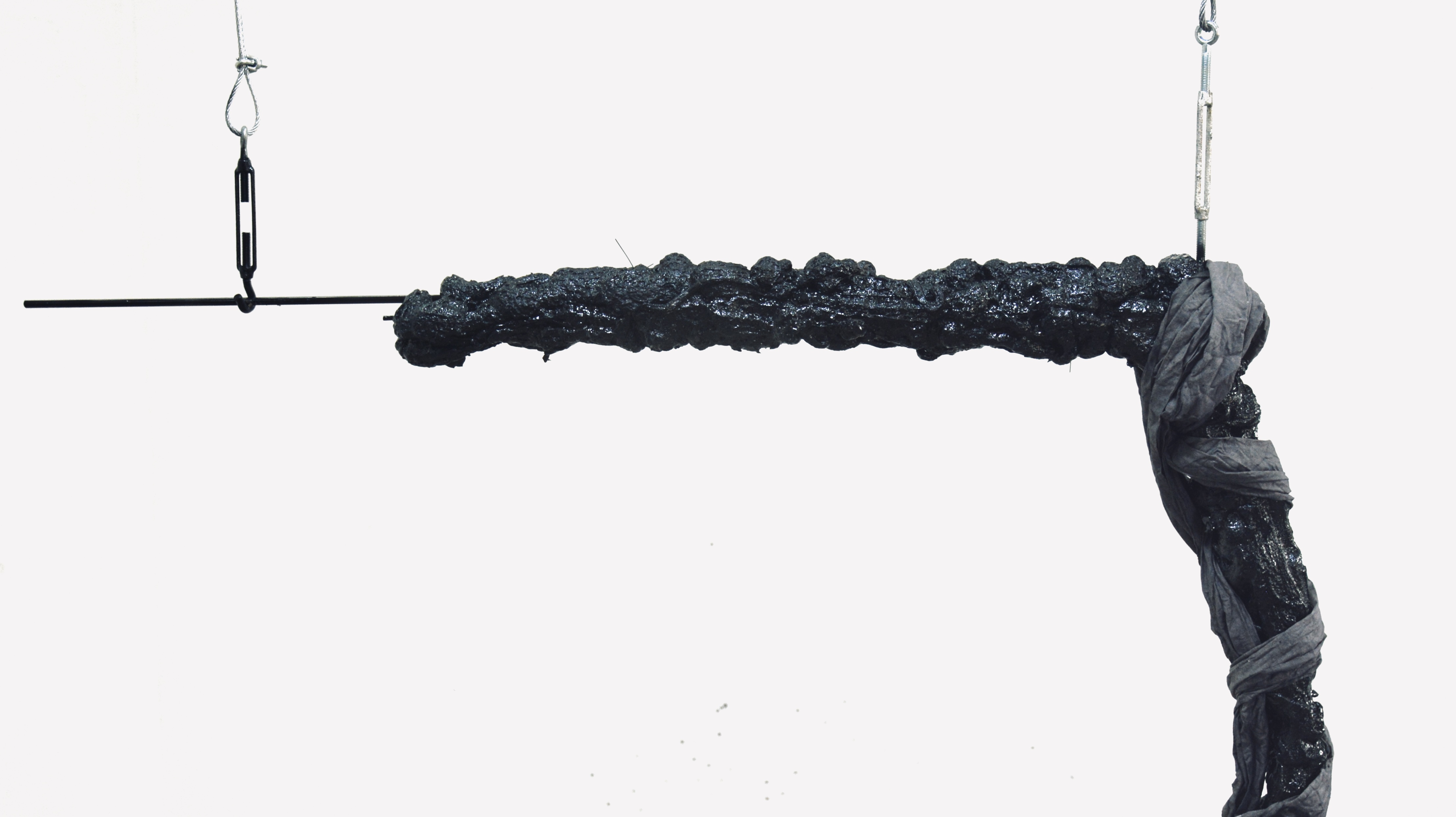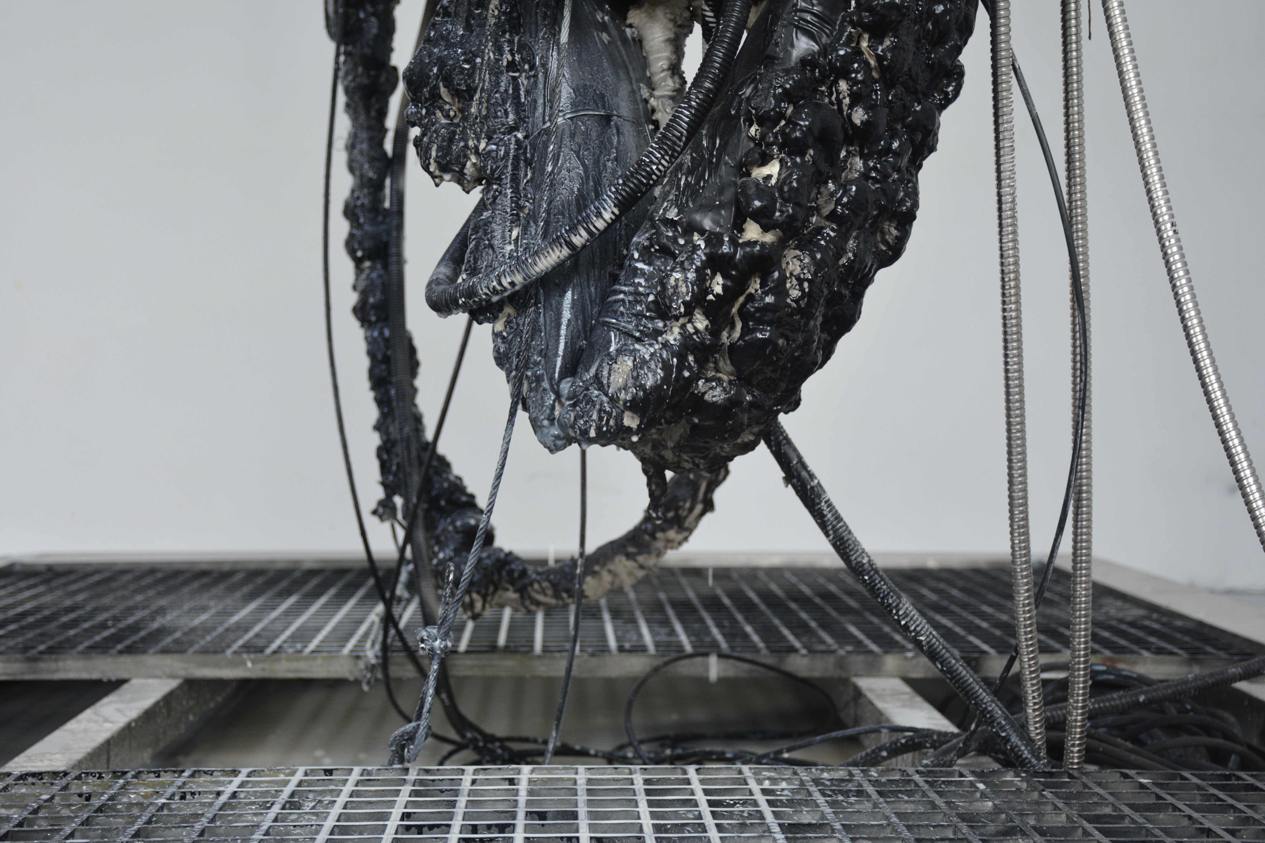 Influenced by Linda Benglis' early works with polyurethane paints, I began experimenting with asphalt, opening up an exploration of this material. In the A Black River Disappears Me series, I experimented with a wide range of materials, including asphalt, polyurethane foam, iron, wood, and ready-made objects. These materials, combined with my exploration of their properties and interactions, reflect the destructive yet transformative power of the black river, symbolizing an ongoing process of decay and reconstruction.