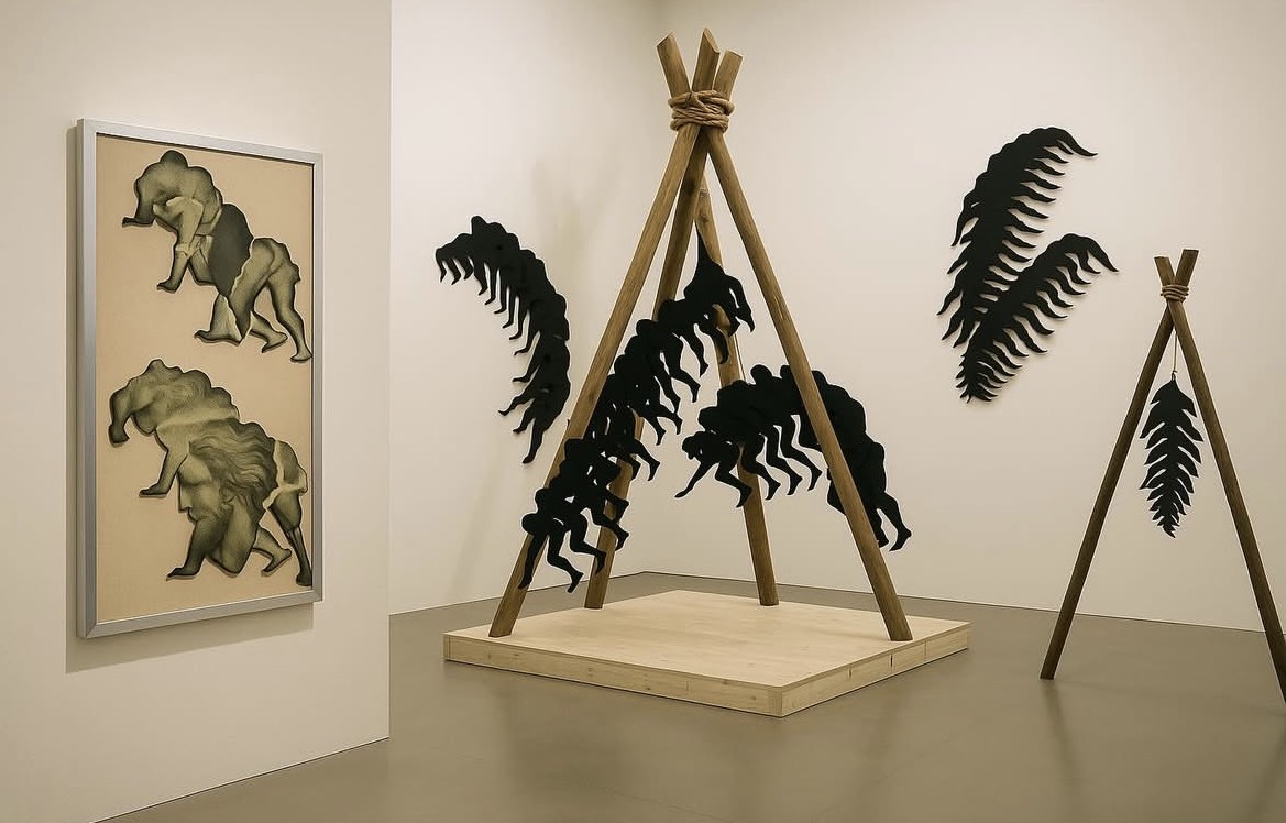 This series explores the tension between motion and stillness through repeated wrestler silhouettes. Cut from dark materials and arranged in organic forms, the works transform violent gestures into soft, plant-like shadows. The installations reflect on the abstraction of masculine bodies and how power is encoded in visual symbols.